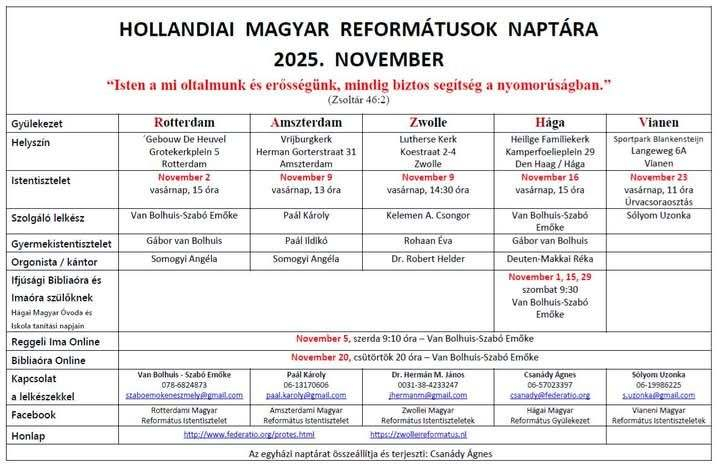 kapcsolat Magyar Református Diaszpóra Központ 4026 Debrecen, Füvészkert u. 4. diasporakozpont@reformatus.hu HomeDiaszpóra központ hírekHollandiai Magyar Reformátusok novemberi alkalmai Hollandiai Magyar Reformátusok novemberi alkalmai A Hágai Magyar Református Gyülekezet Facebook híre:https://www.facebook.com/share/p/1HUURp38EN/