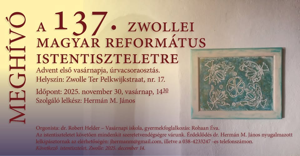 Zwolle - Meghívó magyar református istentiszteletre Advent 1. vasárnapján - 2025. november 30. 14.30 óra