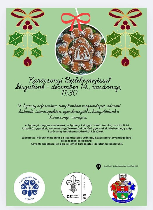 kapcsolat Magyar Református Diaszpóra Központ 4026 Debrecen, Füvészkert u. 4. diasporakozpont@reformatus.hu HomeDiaszpóra központ hírekKarácsonyi betlehemezés Sydneyben - 2025. december 14. 11.30 Karácsonyi betlehemezés Sydneyben - 2025. december 14. 11.30 A Gyülekezet Facebook bejegyzése:https://www.facebook.com/share/p/1KVGDUdwim/