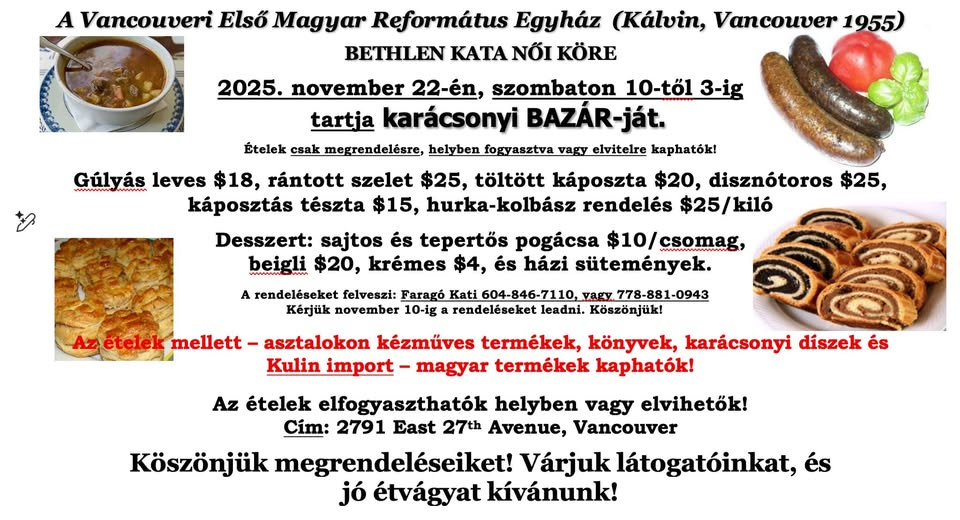kapcsolat Magyar Református Diaszpóra Központ 4026 Debrecen, Füvészkert u. 4. diasporakozpont@reformatus.hu FőoldalDiaszpóra központ hírekVancouveri Első Magyar Református Egyház Bethlen Kata Női Köre - Karácsonyi Bazár 2025. november 22-én 10.00 órától Vancouveri Első Magyar Református Egyház Bethlen Kata Női Köre - Karácsonyi Bazár 2025. november 22-én 10.00 órától A Gyülekezet Facebook bejegyzése:https://www.facebook.com/share/p/162c6UgU4r/