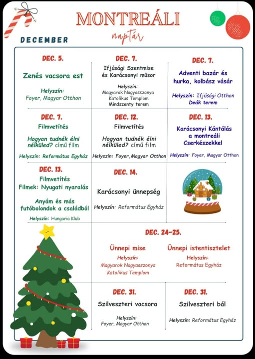 kapcsolat Magyar Református Diaszpóra Központ 4026 Debrecen, Füvészkert u. 4. diasporakozpont@reformatus.hu FőoldalDiaszpóra központ hírekA Montreáli Magyar Református Egyház - Decemberi programok a magyar közösségekben Montreálban A Montreáli Magyar Református Egyház - Decemberi programok a magyar közösségekben Montreálban A Gyülekezet Facebook híre:https://www.facebook.com/share/p/17jxYZuwrp/