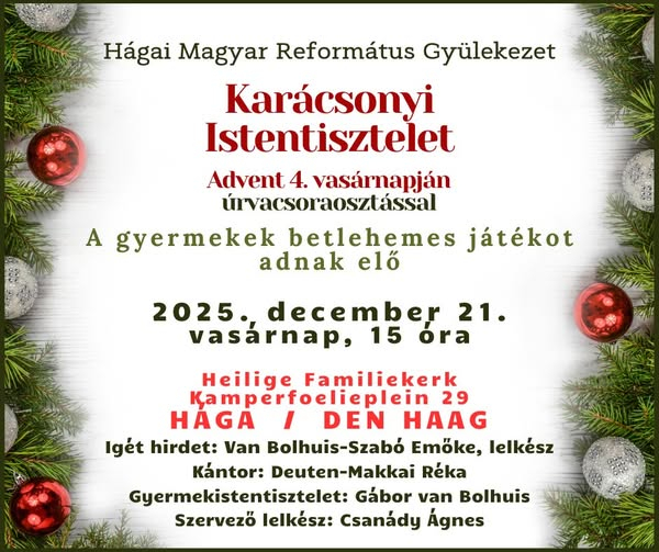 kapcsolat Magyar Református Diaszpóra Központ 4026 Debrecen, Füvészkert u. 4. diasporakozpont@reformatus.hu FőoldalDiaszpóra központ hírekKarácsonyi istentisztelet Advent 4. vasárnapján, 2025. december 21-én 15.00 órától Hágában Karácsonyi istentisztelet Advent 4. vasárnapján, 2025. december 21-én 15.00 órától Hágában A Gyülekezet Facebook híre:https://www.facebook.com/share/p/1DhEbGESsi/