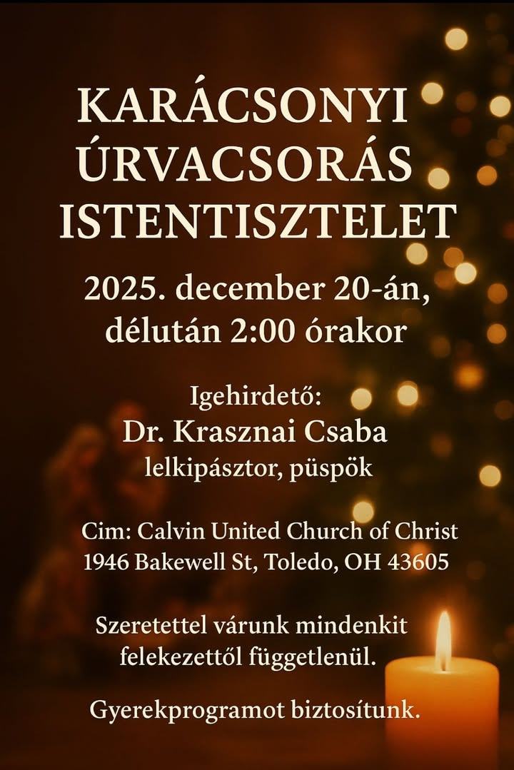 kapcsolat Magyar Református Diaszpóra Központ 4026 Debrecen, Füvészkert u. 4. diasporakozpont@reformatus.hu FőoldalDiaszpóra központ hírekKarácsonyi istentisztelet Toledoban (OH) 2025. december 20-án, 14.00 órától Karácsonyi istentisztelet Toledoban (OH) 2025. december 20-án, 14.00 órától Krasznai G. Csaba püspök úr Facebook bejegyzése:https://www.facebook.com/share/p/1F52kv7tTg/