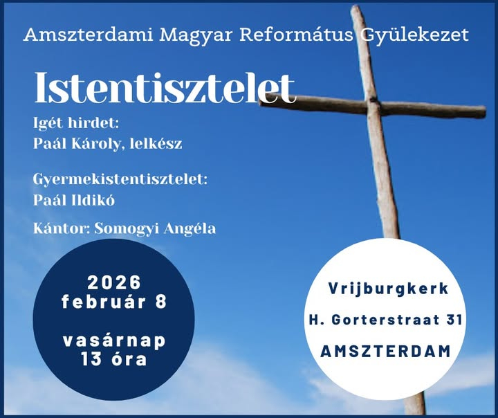 kapcsolat Magyar Református Diaszpóra Központ 4026 Debrecen, Füvészkert u. 4. diasporakozpont@reformatus.hu FőoldalDiaszpóra központ hírekMagyar református istentisztelet Amszterdamban - 2026. február 8. 13.00 óra Magyar református istentisztelet Amszterdamban - 2026. február 8. 13.00 óra A Gyülekezet Facebook bejegyzése:https://www.facebook.com/share/p/1AZyBZSzkJ/