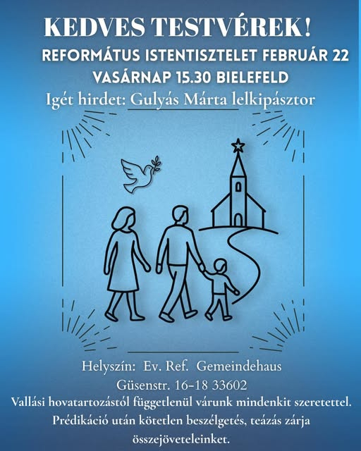 kapcsolat Magyar Református Diaszpóra Központ 4026 Debrecen, Füvészkert u. 4. diasporakozpont@reformatus.hu FőoldalDiaszpóra központ hírekReformátus istentisztelet lesz Bielefeldben 2026. február 22-én 15.30 órától Református istentisztelet lesz Bielefeldben 2026. február 22-én 15.30 órától Refomátusok az NRW-ben Facebook híre:https://www.facebook.com/share/p/18LnYTiavy/