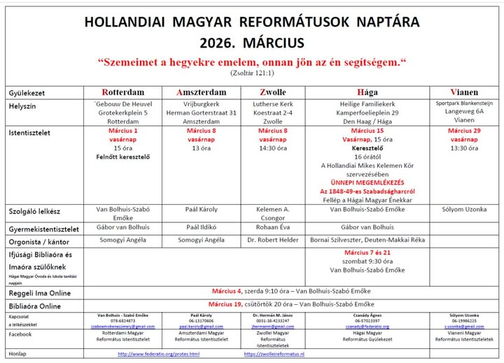 kapcsolat Magyar Református Diaszpóra Központ 4026 Debrecen, Füvészkert u. 4. diasporakozpont@reformatus.hu FőoldalDiaszpóra központ hírekHollandiai Magyar Reformátusok Naptára - 2026. március Hollandiai Magyar Reformátusok Naptára - 2026. március Hágai Magyar Református Gyülekezet Facebook híre:https://www.facebook.com/share/p/1AY398iUTn/