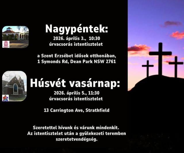 kapcsolat Magyar Református Diaszpóra Központ 4026 Debrecen, Füvészkert u. 4. diasporakozpont@reformatus.hu FőoldalDiaszpóra központ hírekSydney - Nagyheti alkalmakra meghívó Sydney - Nagyheti alkalmakra meghívó A Gyülekezet Facebook bejegyzése:https://www.facebook.com/share/p/1BJGh39UGE/