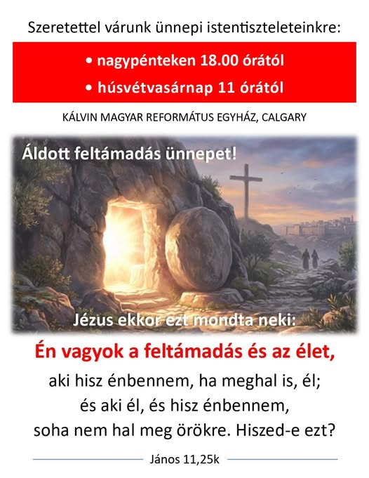 kapcsolat Magyar Református Diaszpóra Központ 4026 Debrecen, Füvészkert u. 4. diasporakozpont@reformatus.hu FőoldalDiaszpóra központ hírekKálvin Magyar Református Egyház Calgary - Meghívó nagypénteki és húsvéti alkalmakra Kálvin Magyar Református Egyház Calgary - Meghívó nagypénteki és húsvéti alkalmakra A Gyülekezet Facebook híre:https://www.facebook.com/share/1CNu6imYxZ/