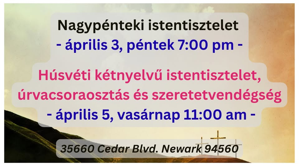 kapcsolat Magyar Református Diaszpóra Központ 4026 Debrecen, Füvészkert u. 4. diasporakozpont@reformatus.hu FőoldalDiaszpóra központ hírekHungarian Reformed Church of San Francisco and Vicinity - Nagypénteki és húsvéti istentiszteletek Hungarian Reformed Church of San Francisco and Vicinity - Nagypénteki és húsvéti istentiszteletek A Gyülekezet Facebook meghívója:https://www.facebook.com/share/p/1LQq9tRdFU/
