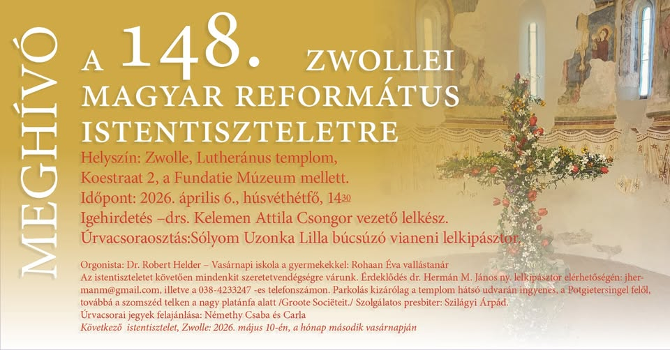 kapcsolat Magyar Református Diaszpóra Központ 4026 Debrecen, Füvészkert u. 4. diasporakozpont@reformatus.hu FőoldalDiaszpóra központ hírek148. zwollei magyar református istentisztelet - 2026. április 6. 14.30 148. zwollei magyar református istentisztelet - 2026. április 6. 14.30 Holland-magyar református kapcsolatok Facebook híre:https://www.facebook.com/share/p/14Zsj2EqeoF/